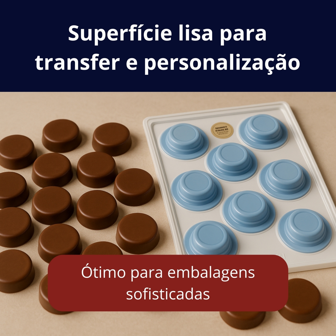 Lave a forma antes do primeiro uso. Posicione o silicone corretamente entre as placas de acetato. Preencha as cavidades com chocolate ou massa conforme a receita. Aguarde a secagem ou resfriamento completo antes de desenformar.