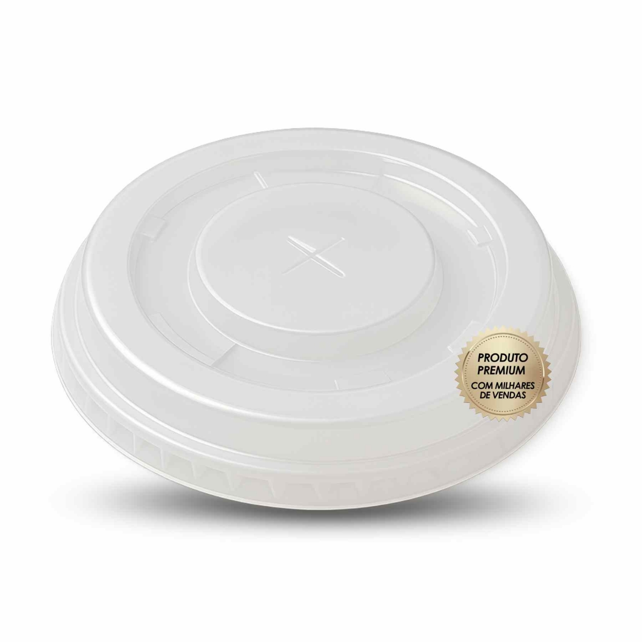 Tampa plástica plana projetada para fechamento de copos, indicada para bebidas frias e uso com canudo, oferecendo praticidade e bom encaixe.