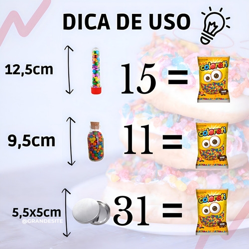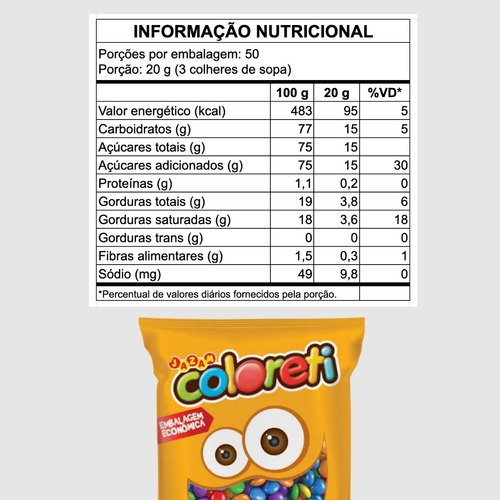 A embalagem contém 1kg de confeitos. A quantidade pode variar conforme o tamanho das pastilhas.