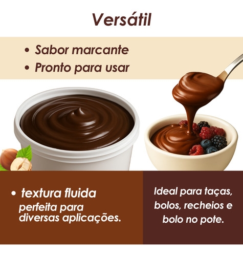 Pronto para uso imediato. Aplique diretamente em recheios, coberturas, cremes e sobremesas. Pode ser utilizado em massas, assados e preparações industriais sem alterar textura ou sabor.