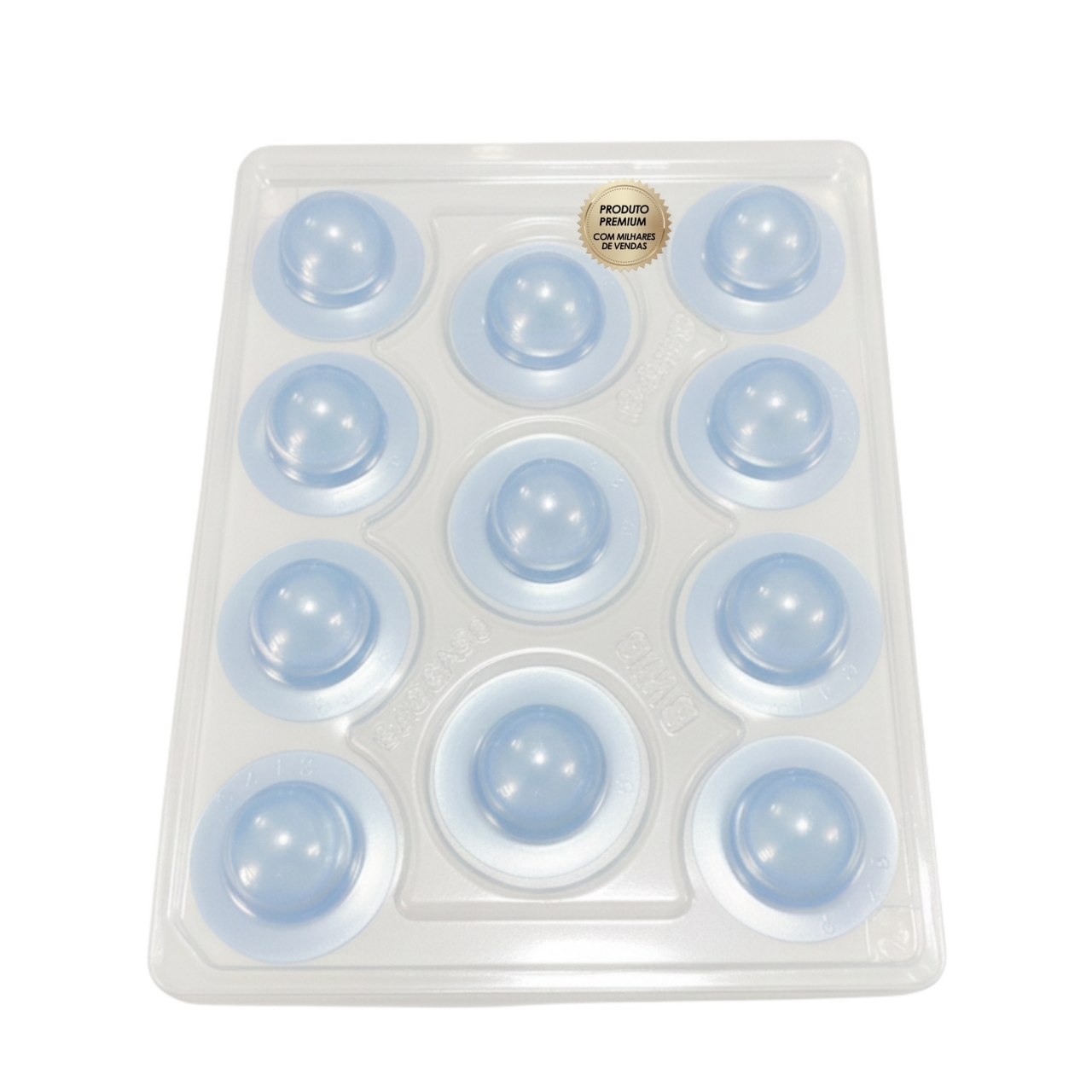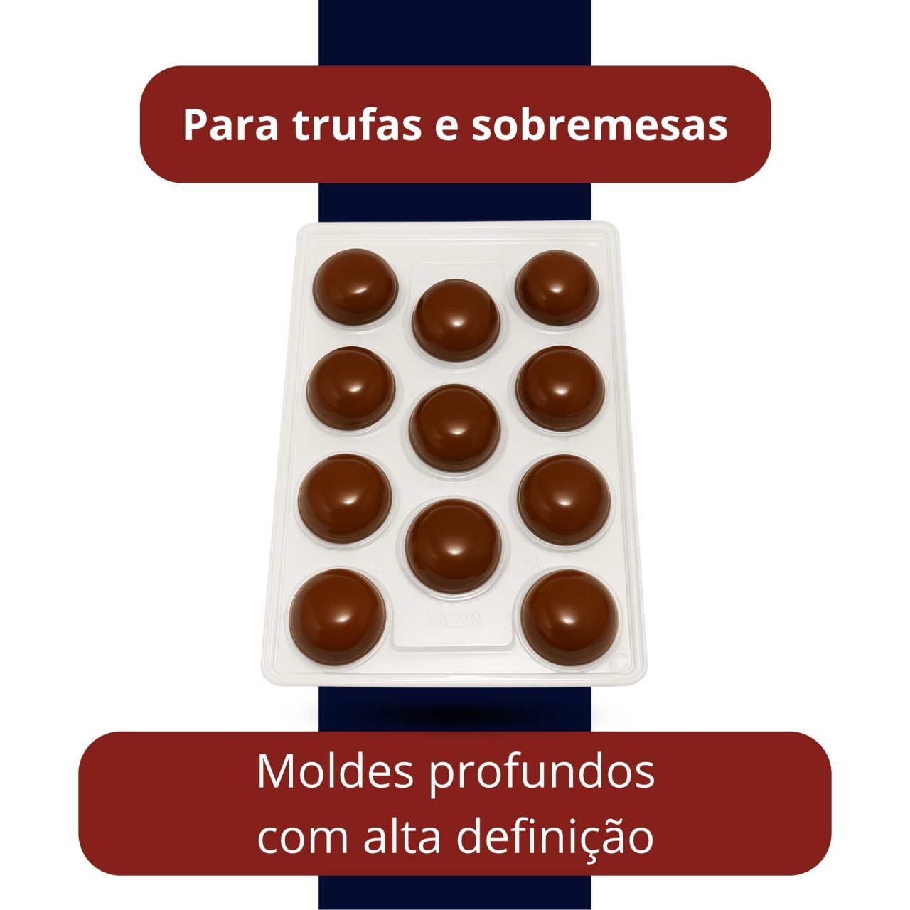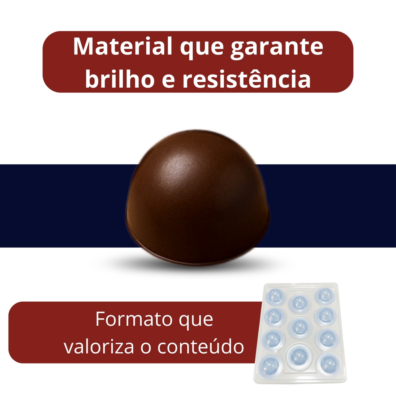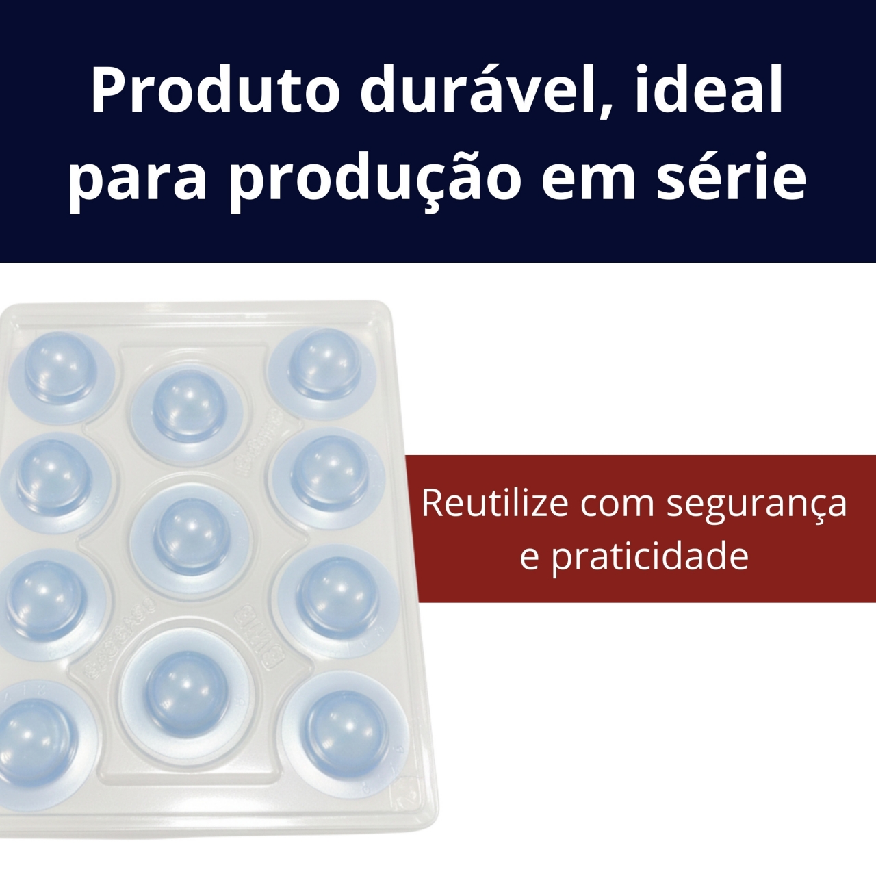 Forma profissional com cavidades esféricas de 30mm e silicone interno removível. Ideal para confeiteiros que buscam padronização, desmolde fácil e acabamento perfeito em bombons, trufas e esferas. Reutilizável, resistente e própria para produção artesanal e comercial.