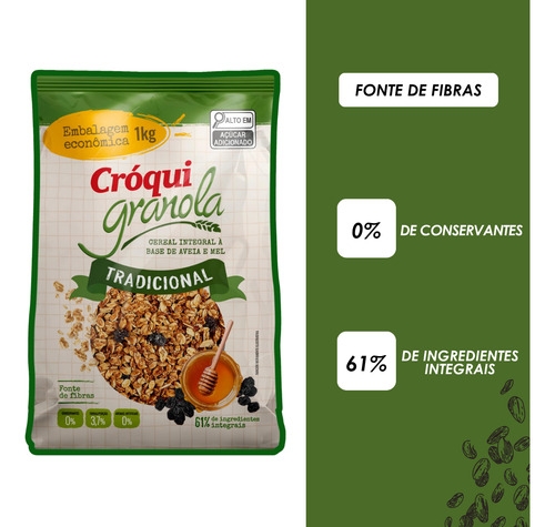 granola croqui tradicional 1kg, cereal com aveia e mel, granola saudável sem açúcar, cereal integral com fibras, granola para café da manhã, croqui cereal matinal, embalagem econômica granola, croqui com mel, cereal com 61% integrais, granola sem sódio, croqui aveia e mel, granola com fibras naturais, granola integral para dieta, croqui granola 1kg, cereal crocante com mel e aveia, granola para iogurte